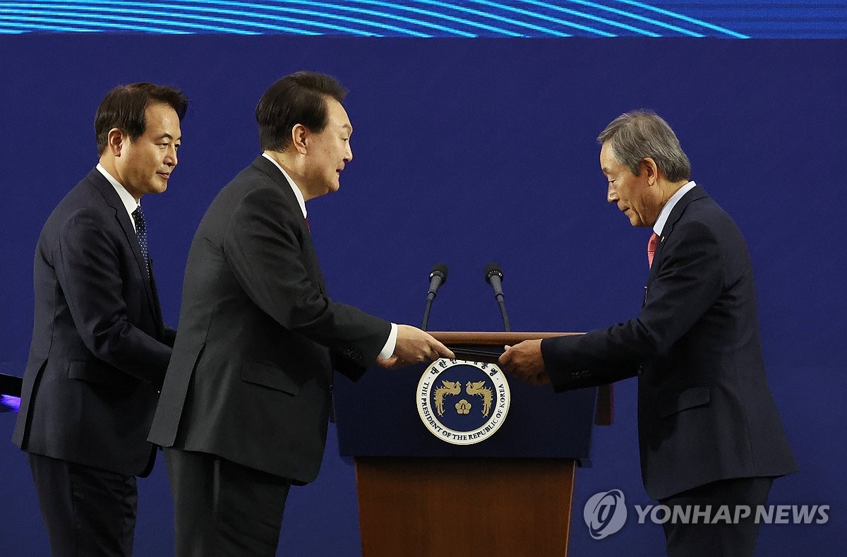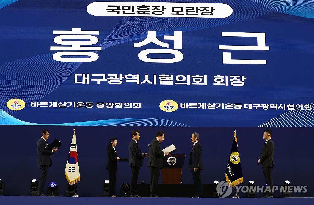 (대구=연합뉴스) 임헌정 기자 = 윤석열 대통령이 7일 대구 엑스코에서 열린 2023년 바르게살기운동 전국회원대회에서 홍성근 바르게살기운동 대구광역시협의회 회장에게 국민훈장 모란장을 수여하고 있다. 2023.11.7 [대통령실통신사진기자단]